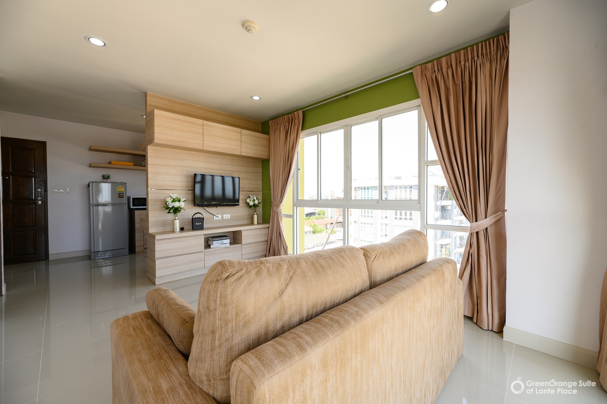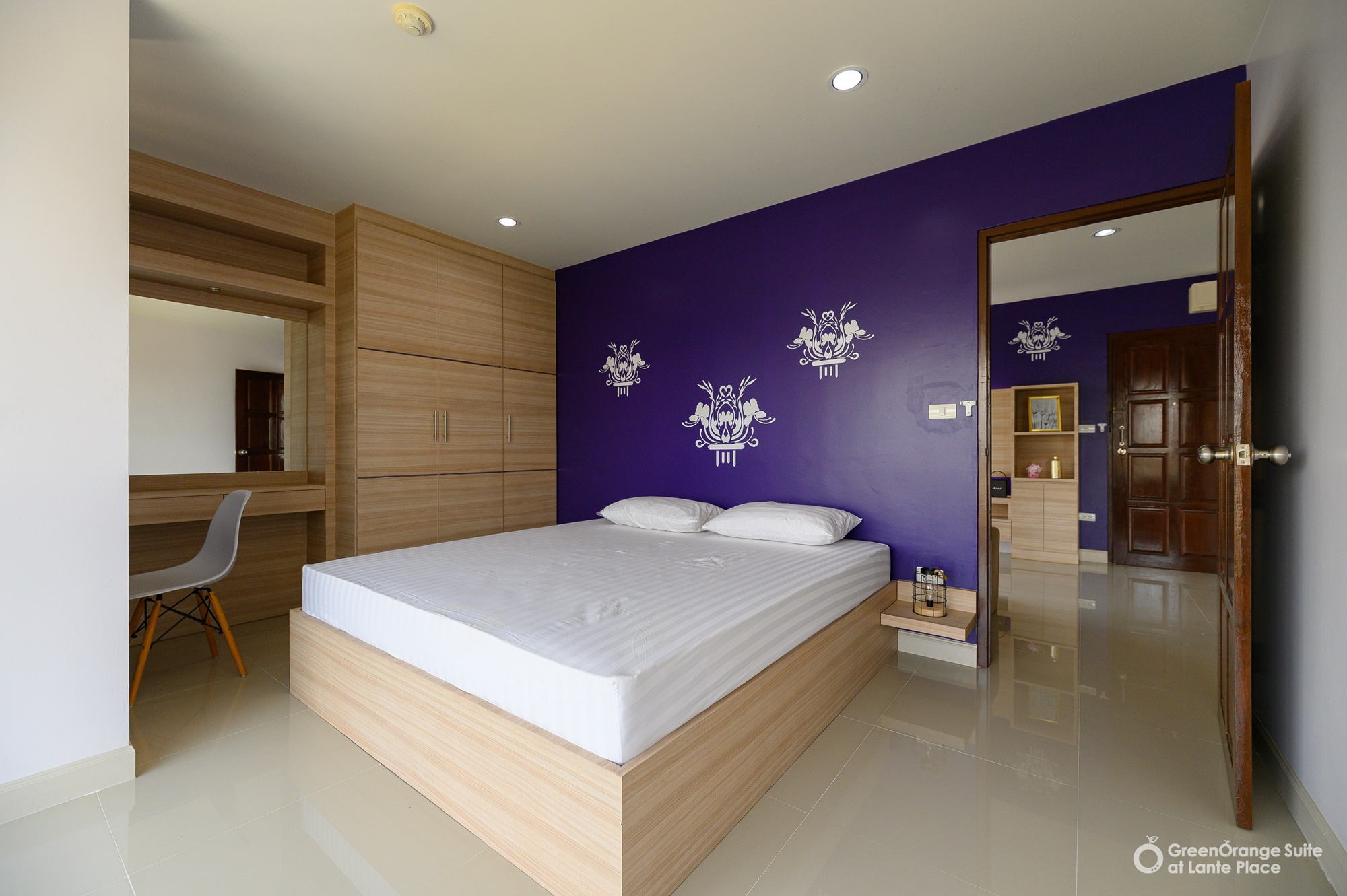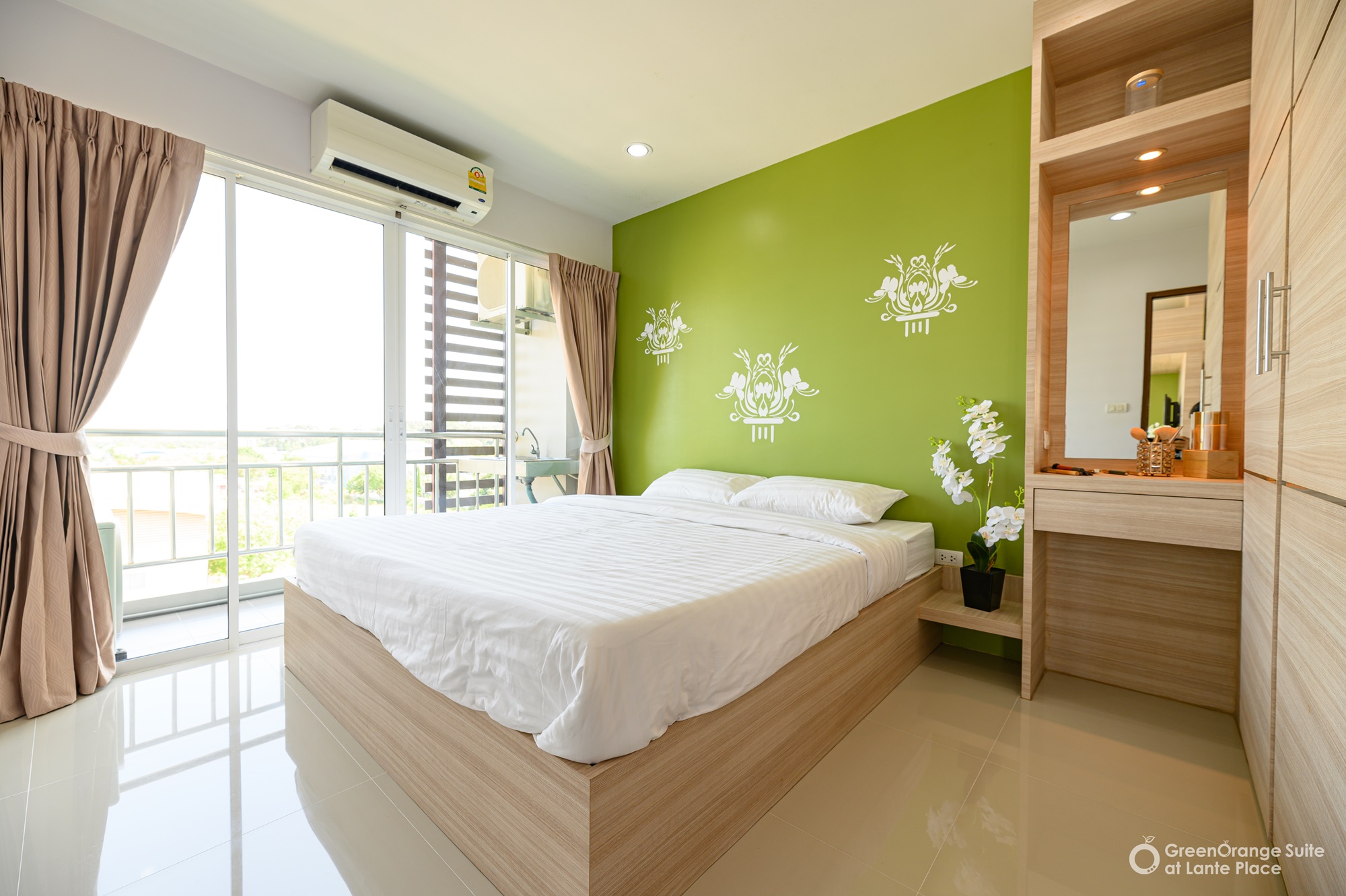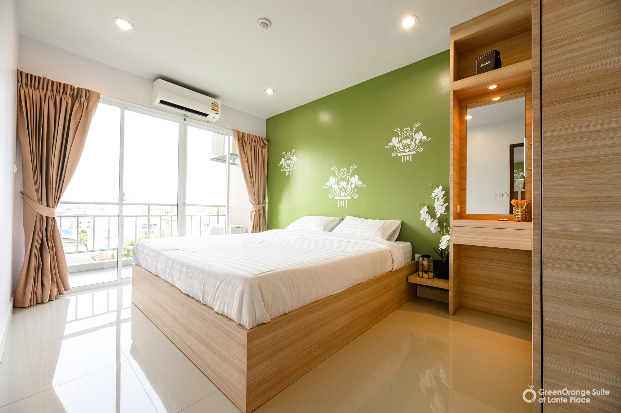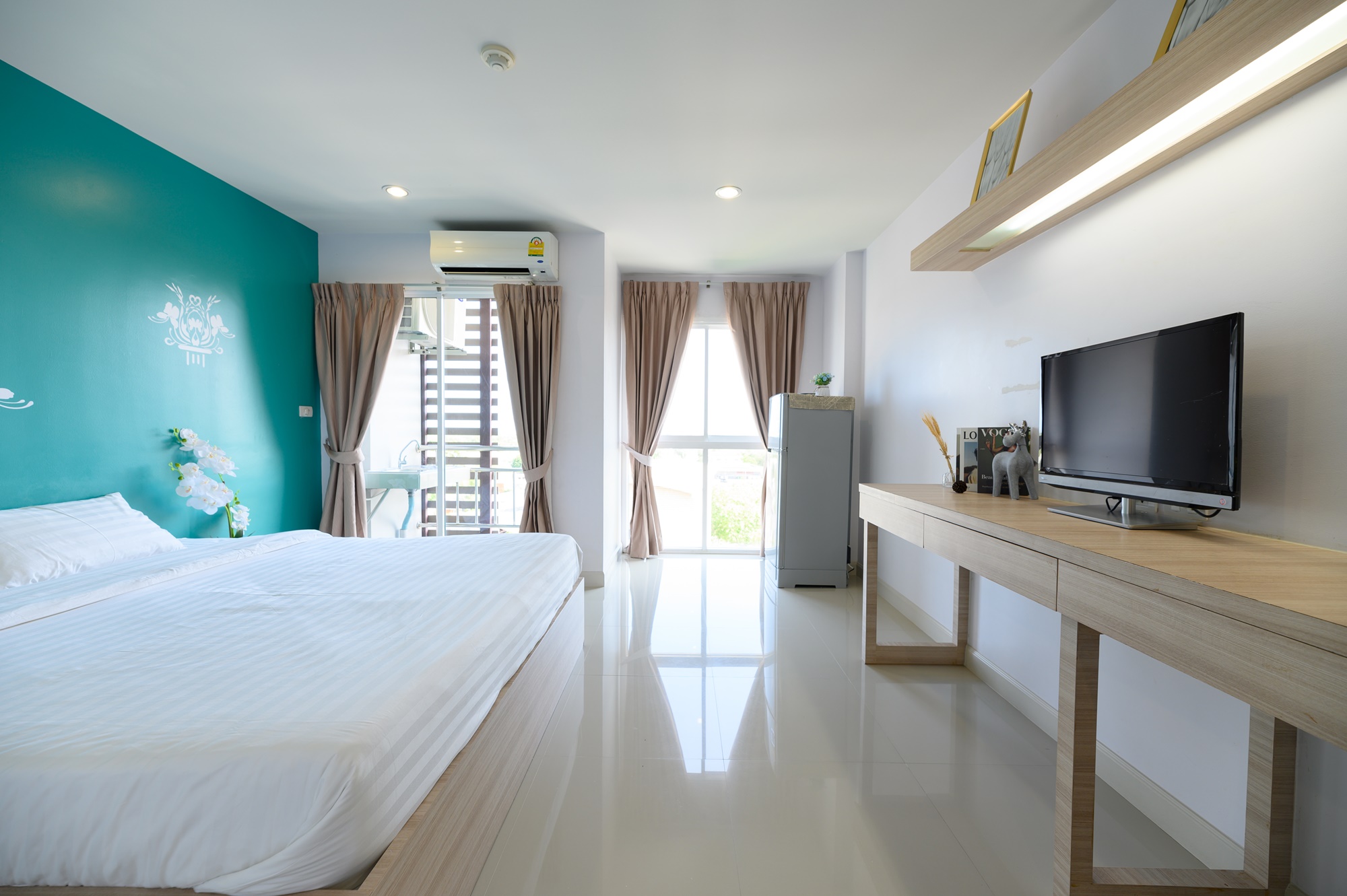 ทุกห้องประกอบด้วย : เตียง ชั้นข้างหัวเตียง ตู้เสี้อผ้า โต๊ะเครื่องแป้ง แบบ Build in สี earth tone ให้ความรู้สึกสบายตา, sink ล้างจานริมระเบียง, ทีวี ตู้เย็น ที่นอน โซฟา จัดไว้ให้พร้อม ในห้องน้ำมีม่านแยกโซนและเครื่องทำน้ำอุ่นให้อีกด้วย