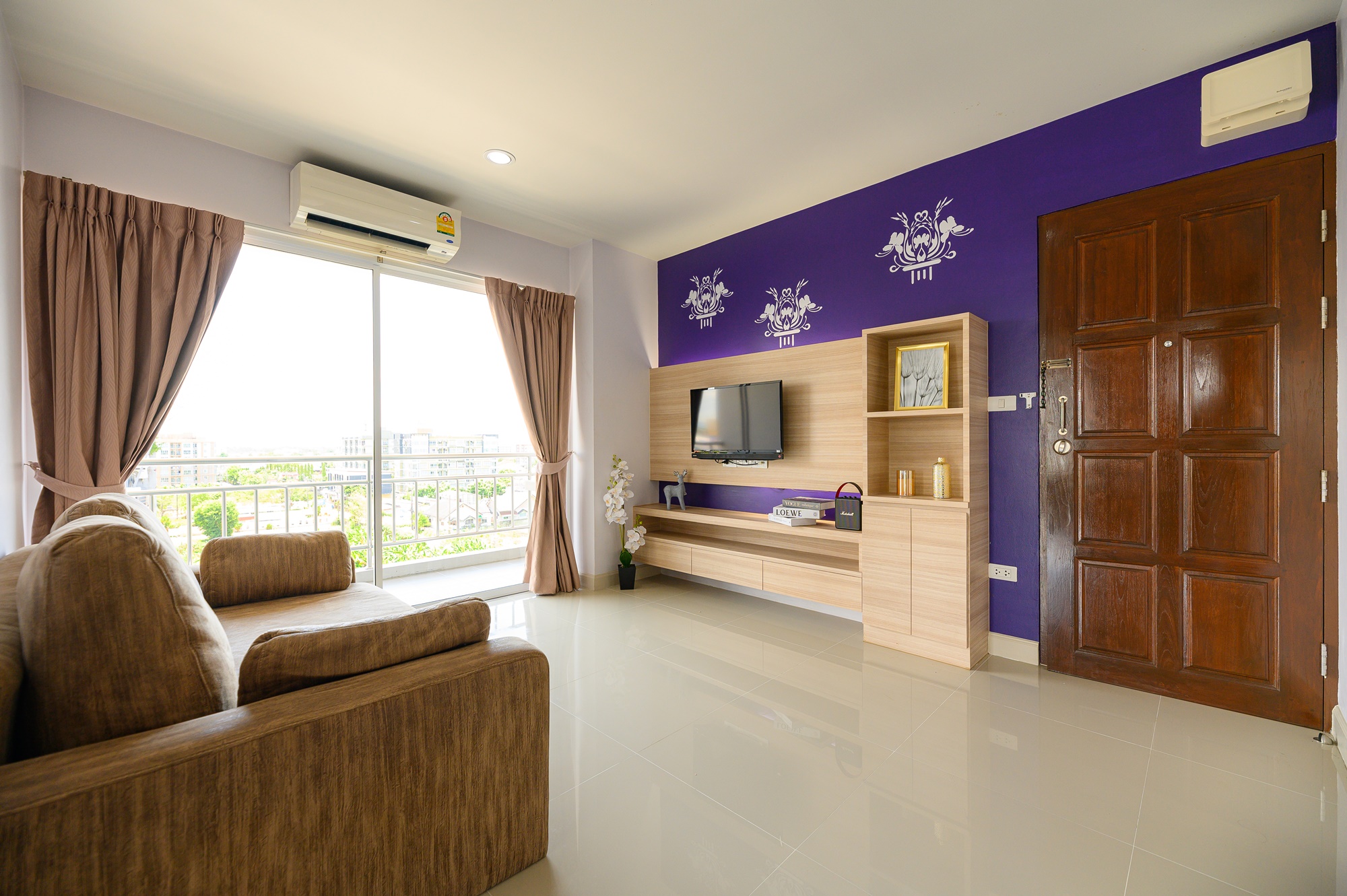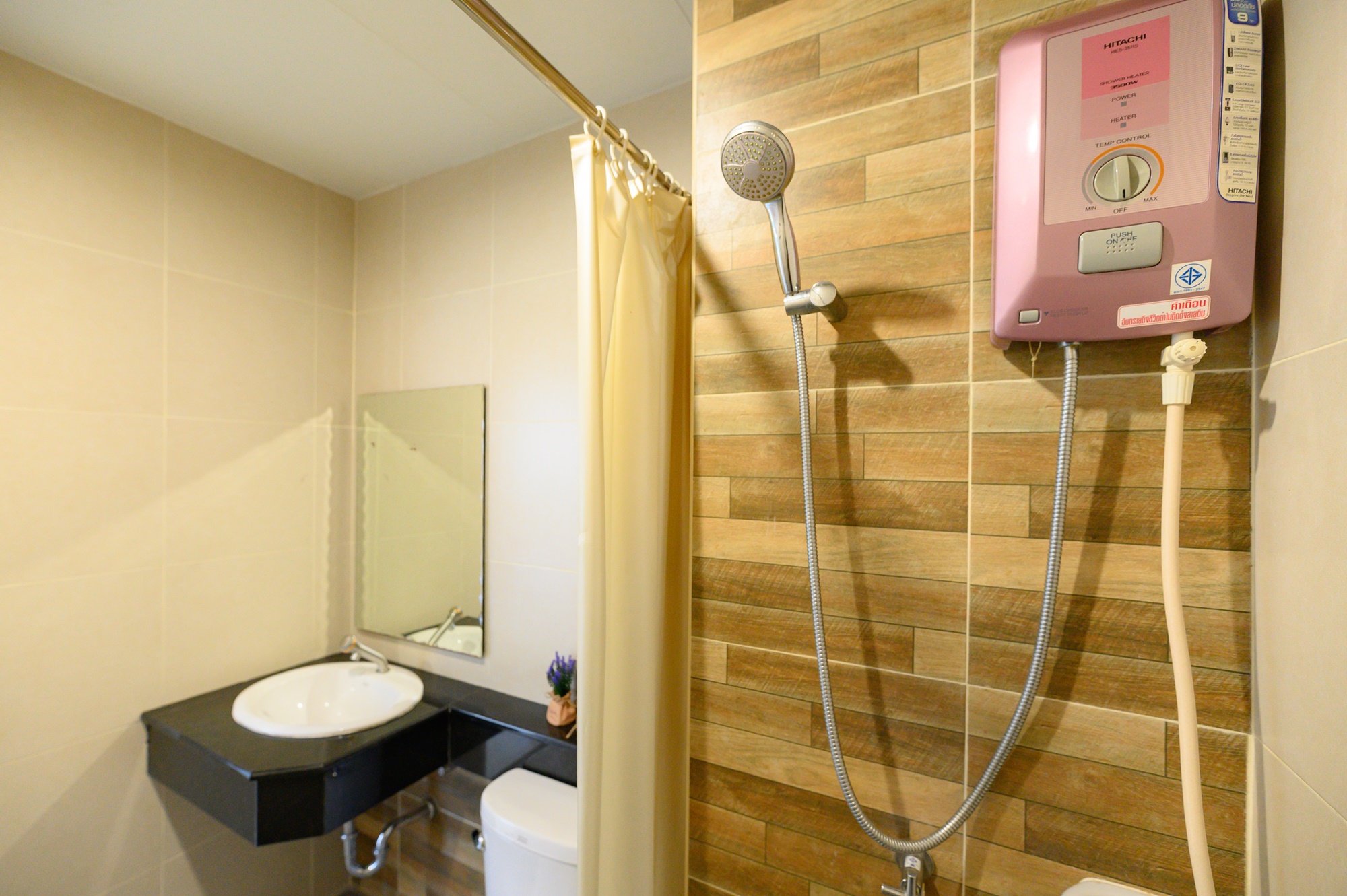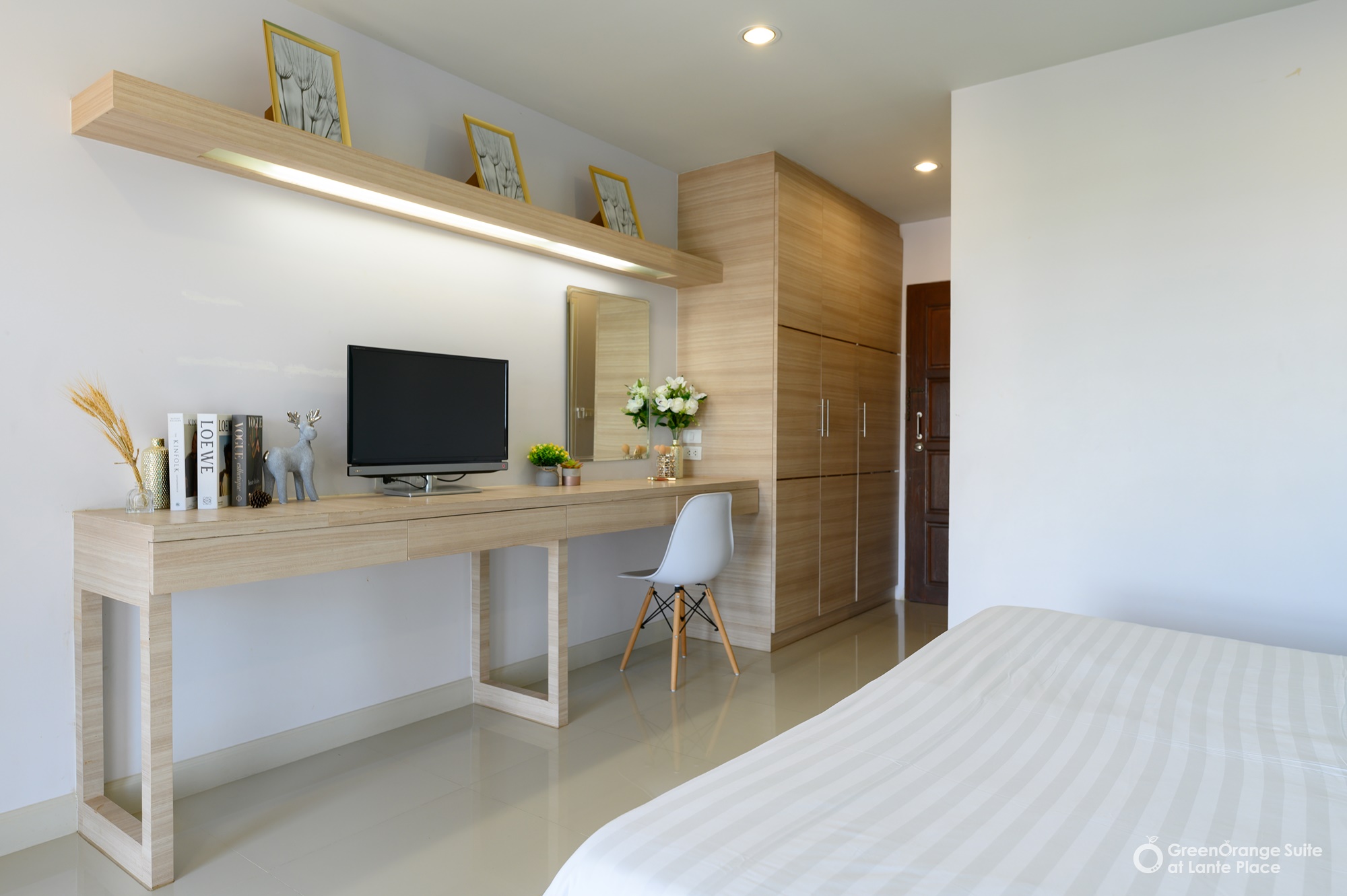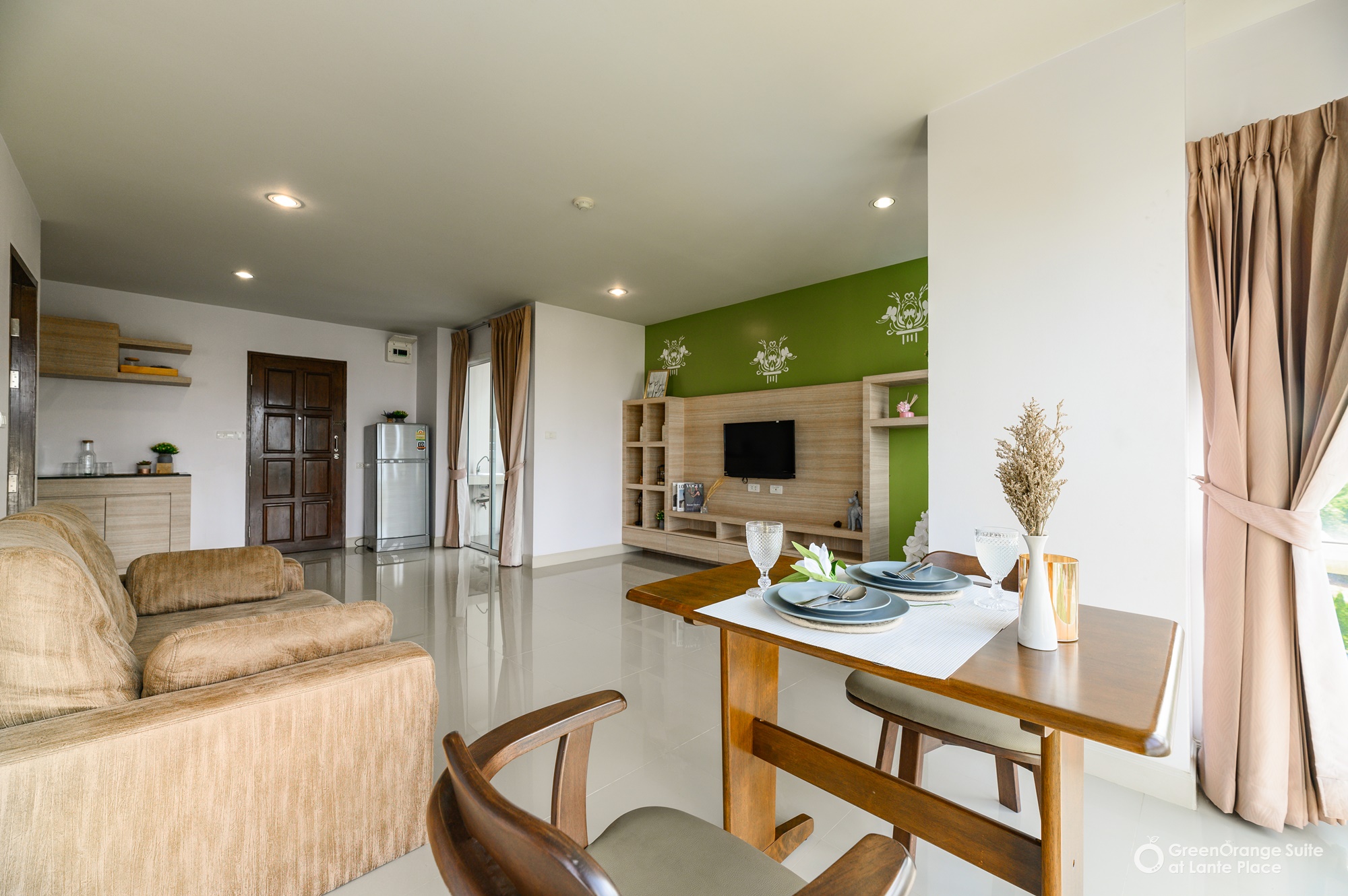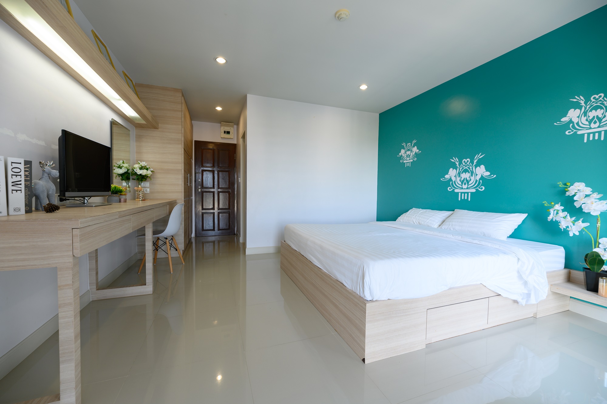 ทุกห้องประกอบด้วย : เตียง ชั้นข้างหัวเตียง ตู้เสี้อผ้า โต๊ะเครื่องแป้ง แบบ Build in สี earth tone ให้ความรู้สึกสบายตา, sink ล้างจานริมระเบียง, ทีวี ตู้เย็น ที่นอน โซฟา จัดไว้ให้พร้อม ในห้องน้ำมีม่านแยกโซนและเครื่องทำน้ำอุ่นให้อีกด้วย